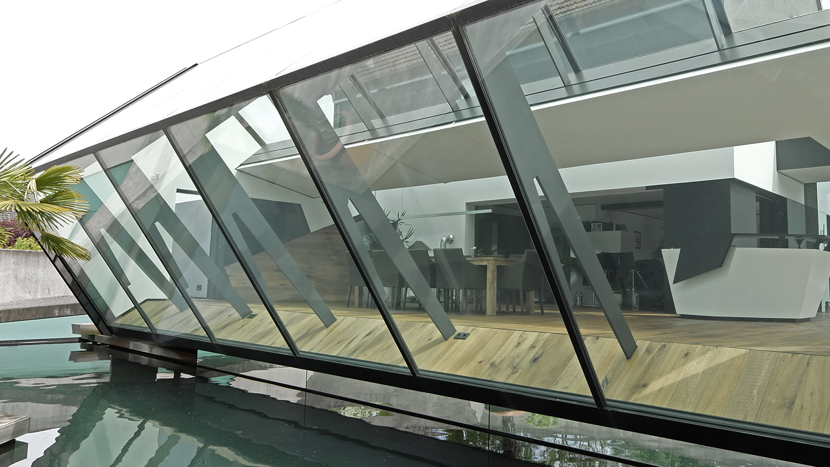 Die Erweiterung des bestehenden Wohnhauses der 60er Jahre wurde als „Glaskörper“ konzipiert. Beton, Holz und Stahl prägen das Erscheinungsbild der Architektur. Durch die minimierte Stahlkonstruktion wirkt der Innenraum filigran und leicht. Die Reflexionen der Wasseroberfläche und die großzügige Verglasung erzeugen intensive Raumstimmungen. Die Jahreszeiten sind emotional erlebbar.